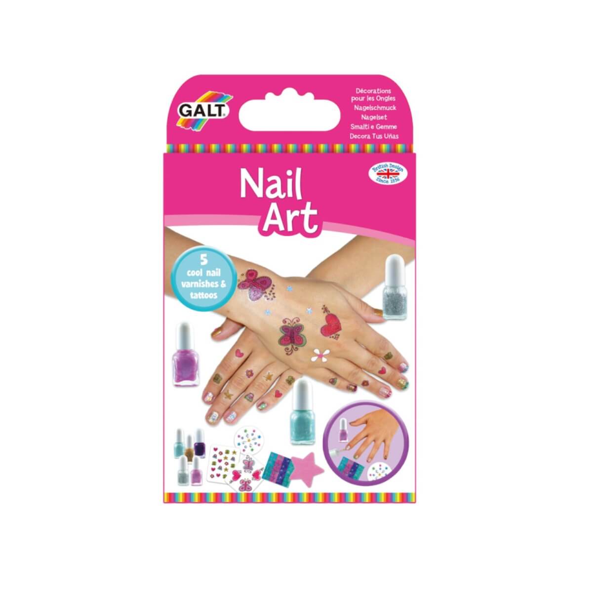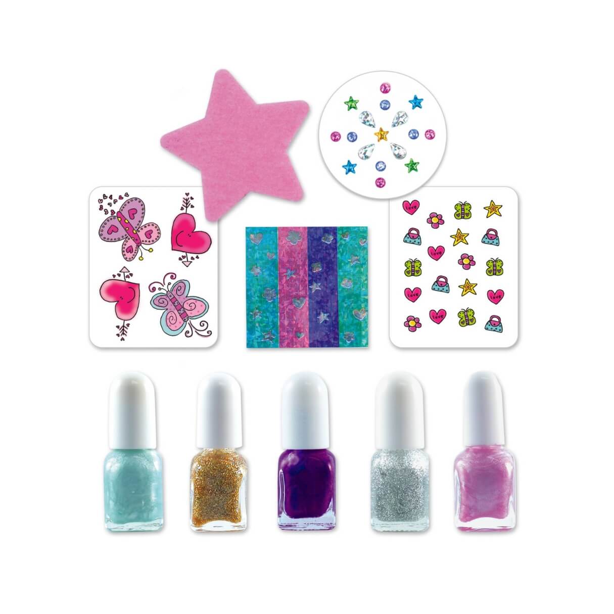 pedrería, escarcha o tiras holográficas. También puede decorar manos y dedos con tatuajes. Contenido: 3 esmaltes de uñas de colores, 2 esmaltes de uñas con escarcha, gemas para uñas, tiras holográficas, tatuajes y limas en forma de estrella.