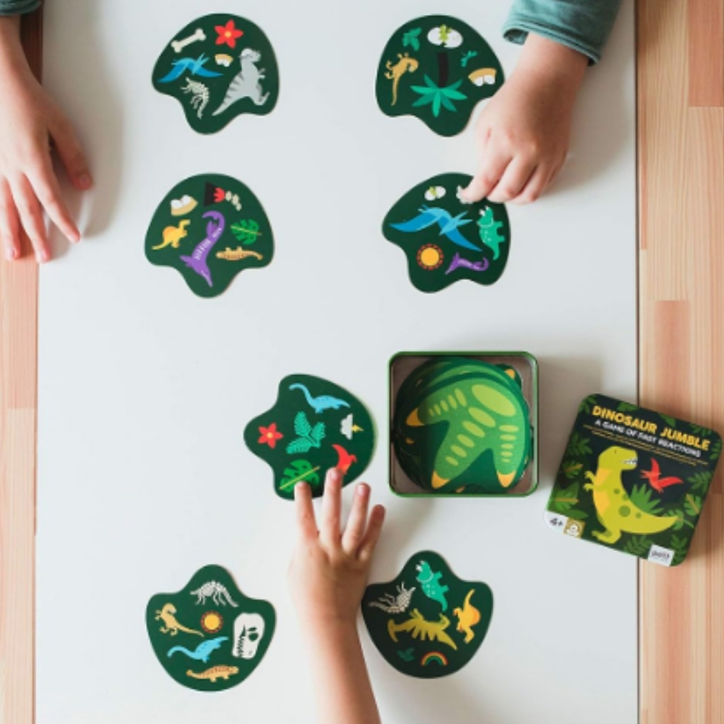 ¡Diviértete con este juego Dinosaur Jumble de reacciones rápidas de Petit Collage!