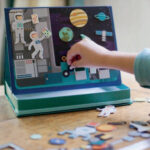Decora una escena en el espacio exterior o el interior de una estación espacial. Este juego portátil cuenta con dos fondos para elegir y más de 50 piezas de juego magnéticas. ¡Haz que los astronautas trabajen en su misión galáctica en la estación espacial o en una caminata espacial y crea infinitas combinaciones de escenas!