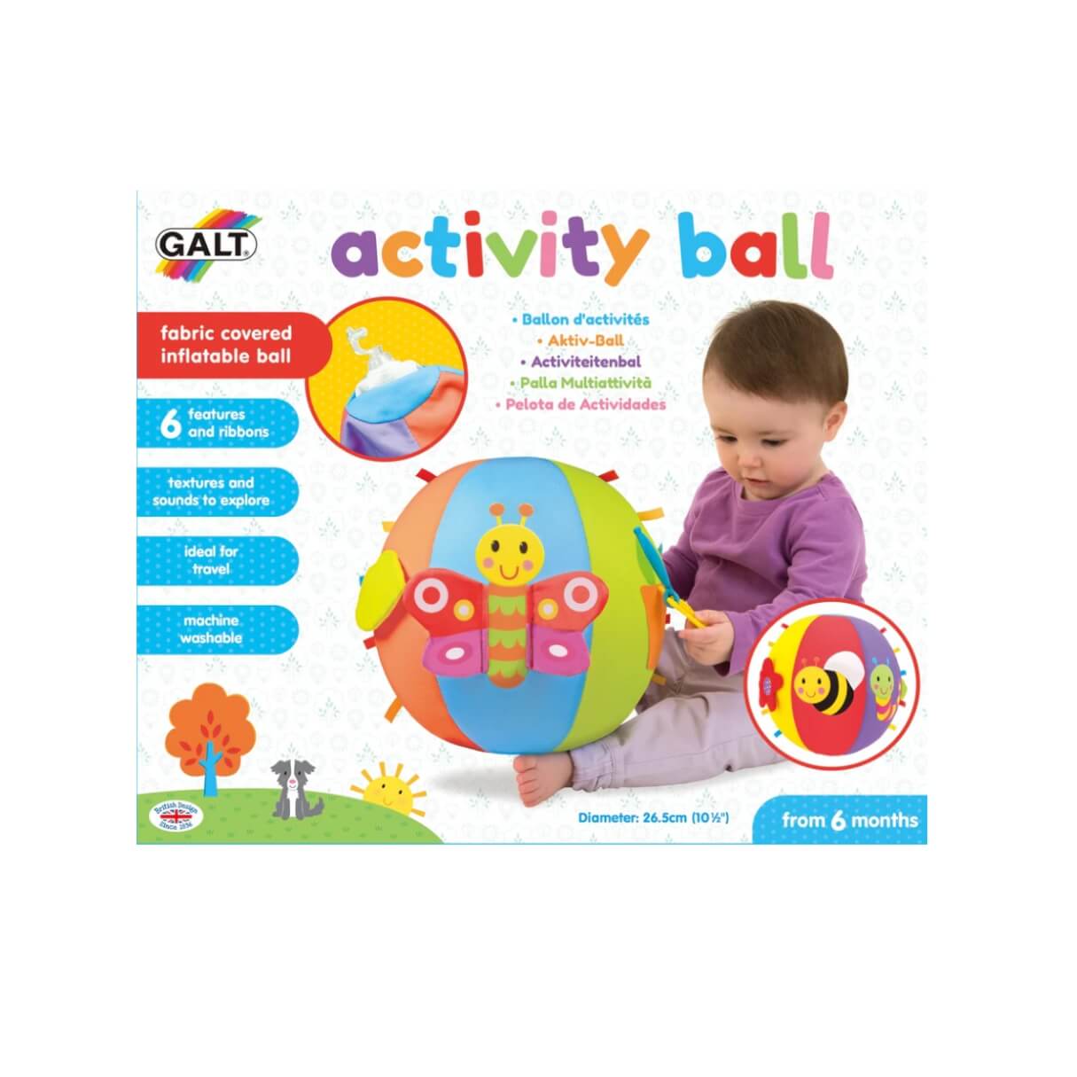 Pelota inflable de tela con 6 actividades y etiquetas de cinta de colores.