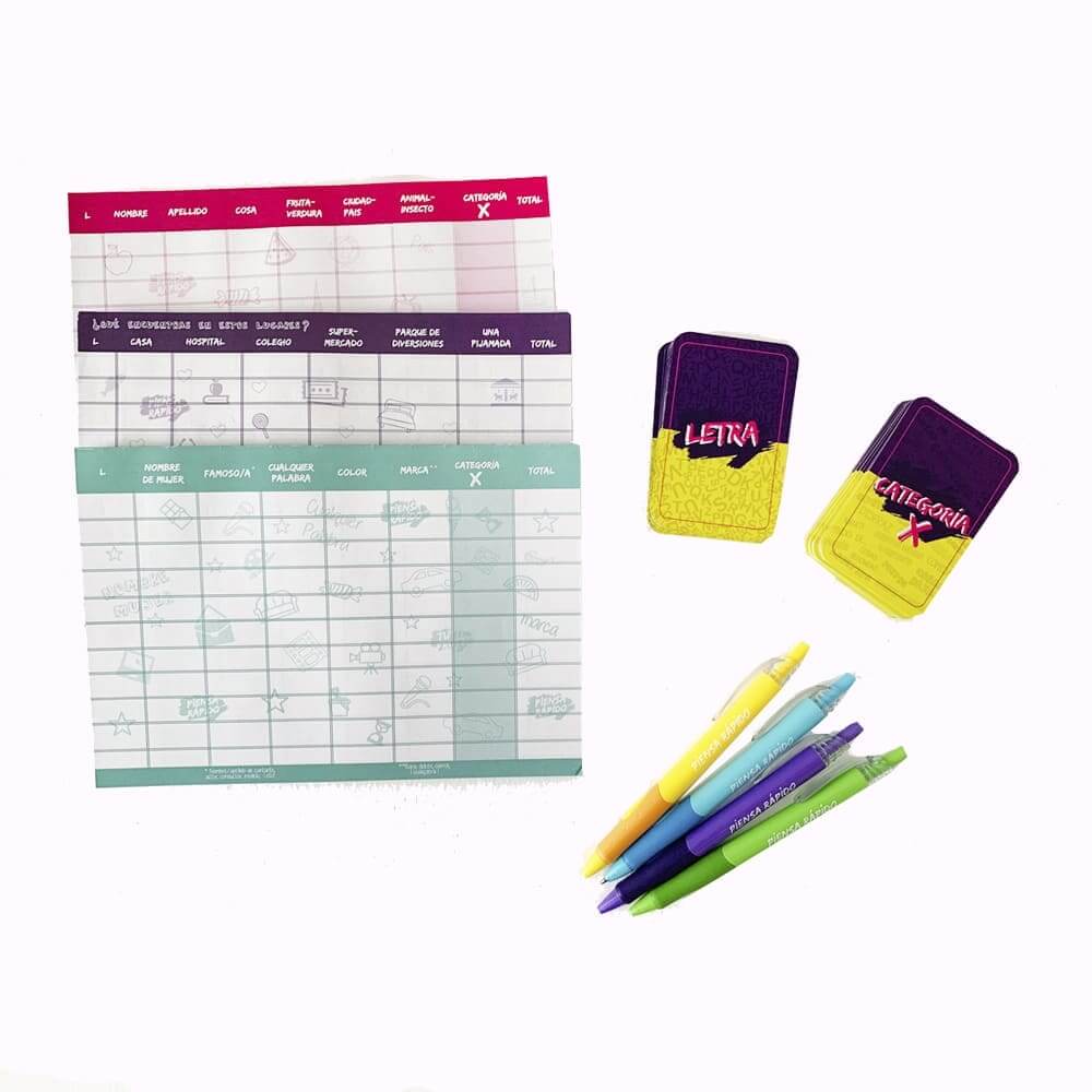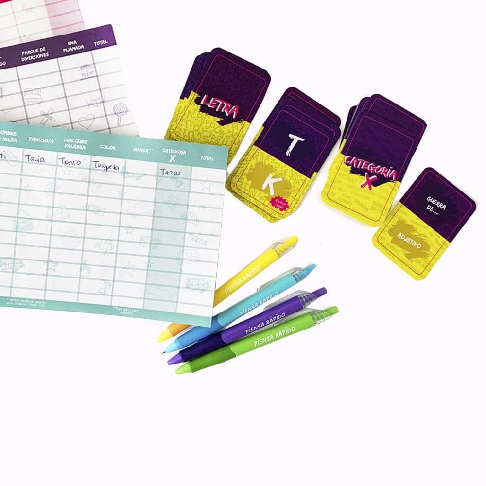 Nombre, apellido, cosa, color…¿Te suena conocido? ¿Eres amante de jugar Tutti Frutti? Piensa Rápido es un increíble juego de mesa con la misma dinámica y algunas variantes para hacerlo más divertido aún. Con tres blocks diferentes, tarjetas de categorías que cambian en cada jugada y nuevas opciones de letras, amarás esta nueva forma de jugarlo. Las letras se escogen con tarjetas “Letra”, que además del abecedario, traen sorpresas como “que termine en O”, “que empiece con MA”, entre otras. Además, en cada jugada hay una categoría sorpresa que hará que siempre juegues de una manera diferente. ¡Jugarlo es un vicio! Ideal para las tardes y noches con la familia o amigos. Incluye:3 Blocks distintos de 70 hojas cada uno, 20 Tarjetas Categoría, 20 Tarjetas Letra, 4 Lapiceros, Instrucciones. Material: Cartón, lapiceros. Edad recomendada: 8 años a más. Medida referencial del Producto: Blocks A5 / Tarjetas 8x5cm