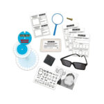 Contenido: Almohadilla de sello de tinta, hojas de evidencia de huellas dactilares, hojas de huellas dactilares sospechosas, polvo de huellas dactilares, lupa, piezas decodificadoras de mensajes, gafas