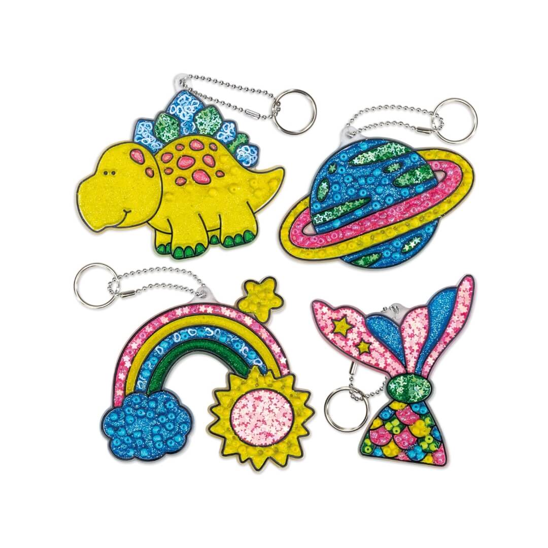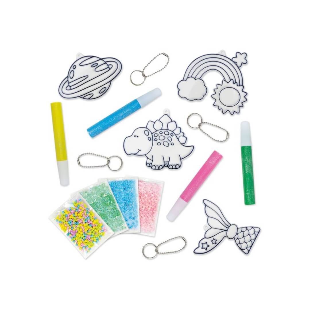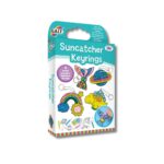 4 formas de atrapasol, 4 tubos de pintura flexibles, cuentas de colores surtidos, 3 bolsas de lentejuelas, 4 llaveros y guía.
