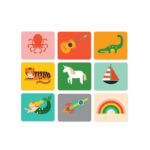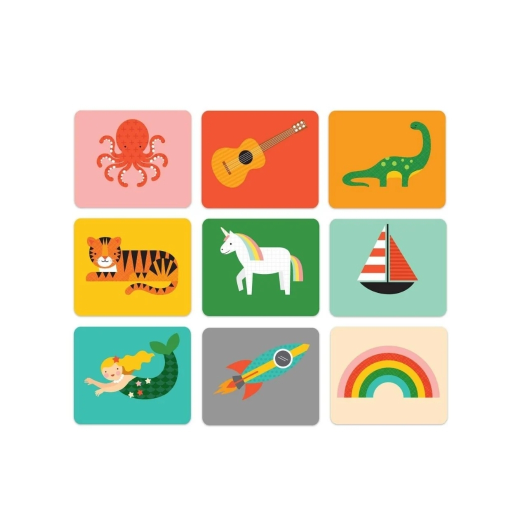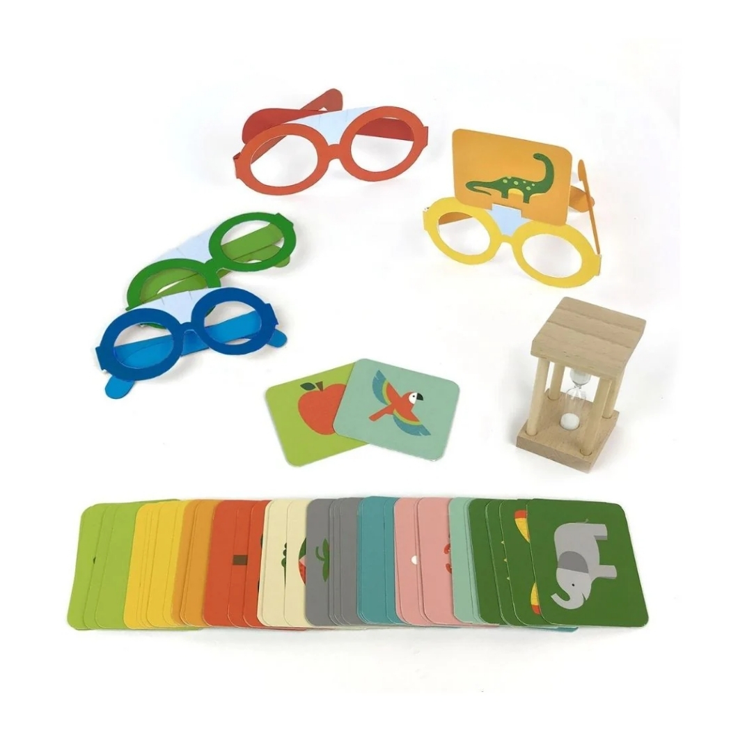 Incluye 4 vasos de cartas en 2 tamaños, 1 cronómetro y 50 tarjetas de objetos coloridas.