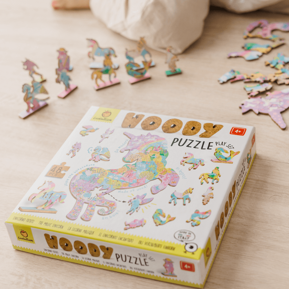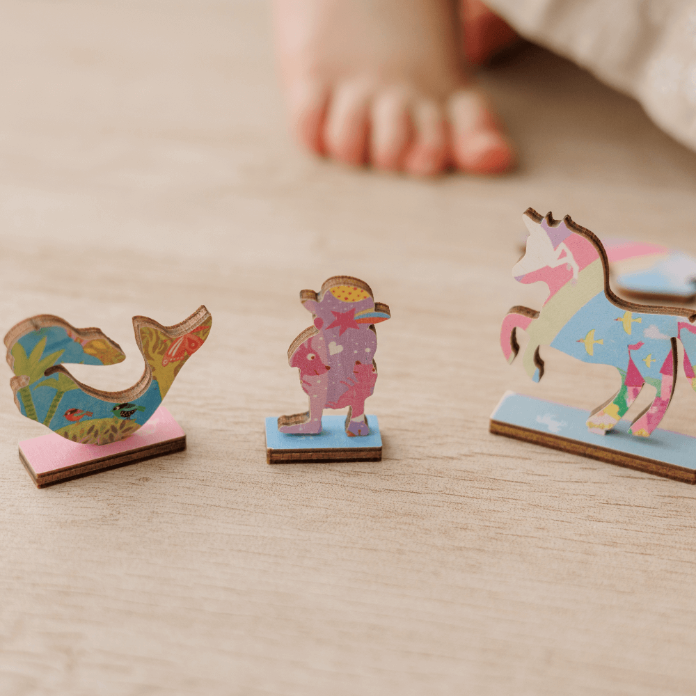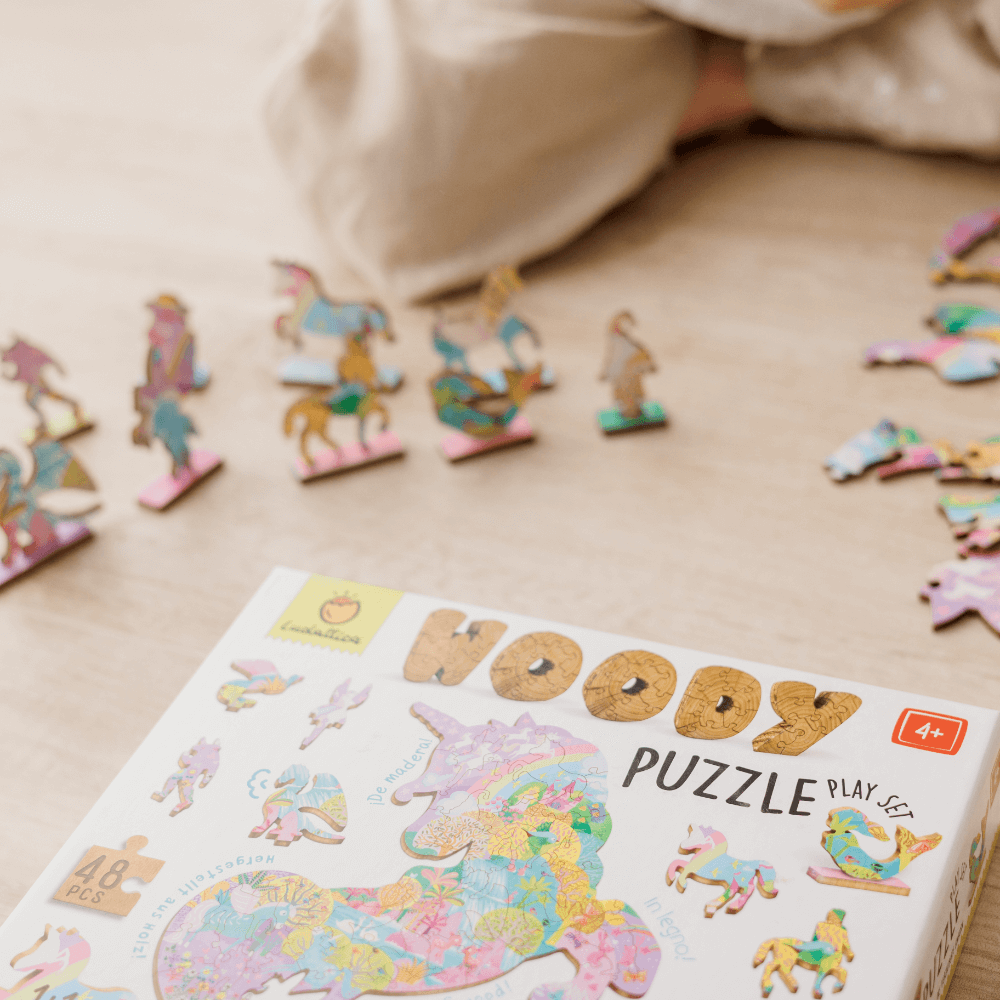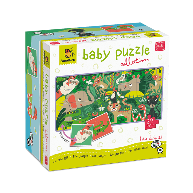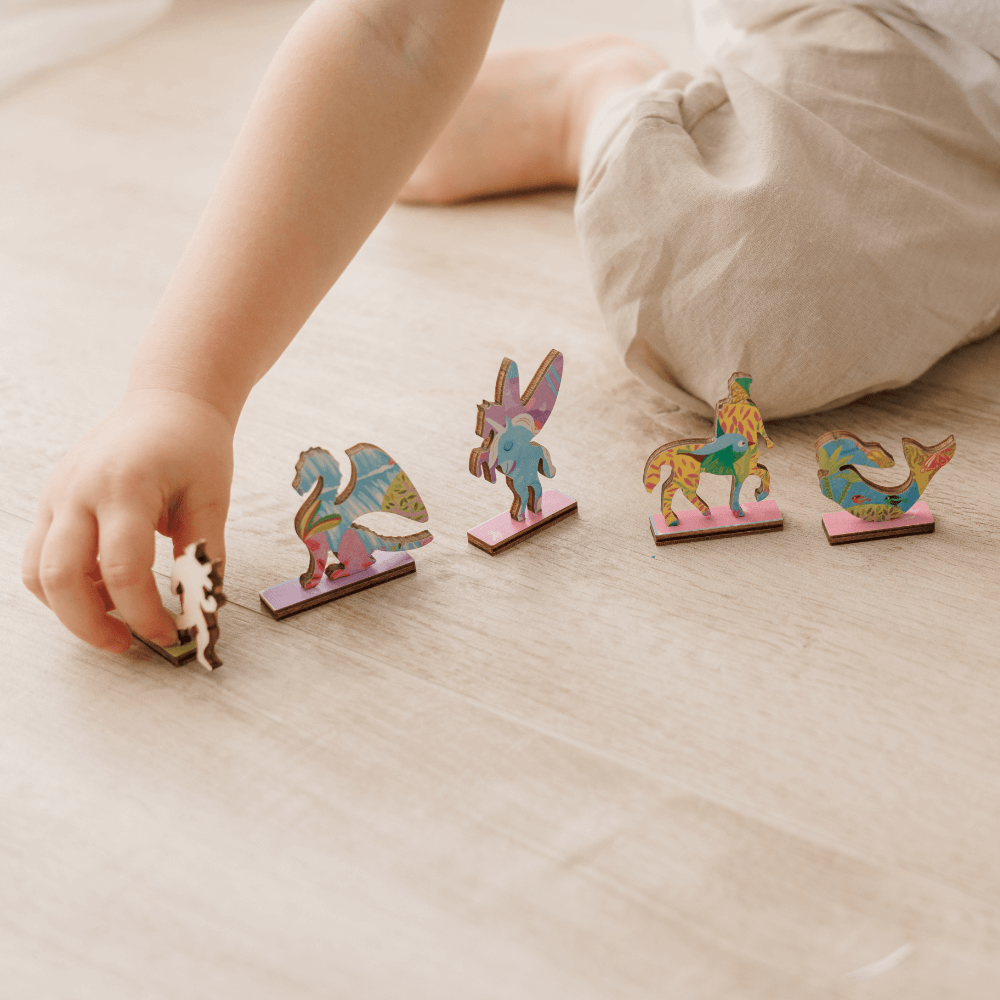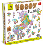 Un rompecabezas de madera de forma especial en el que está representado un colorido paisaje. Entre las piezas que componen el rompecabezas hay 12 animales perfilados que también se pueden colocar de pie sobre sus bases. El juego estimula la lógica, las habilidades visoespaciales y la motricidad fina.