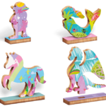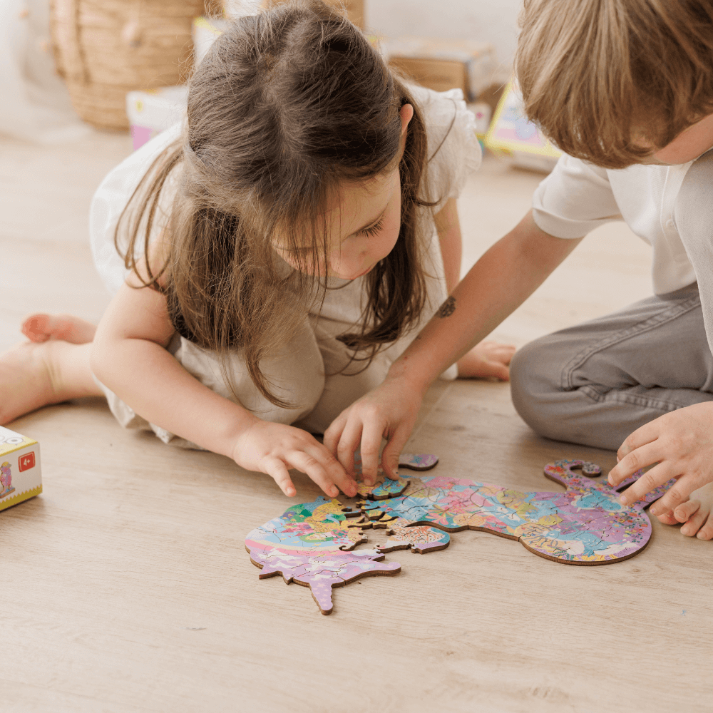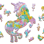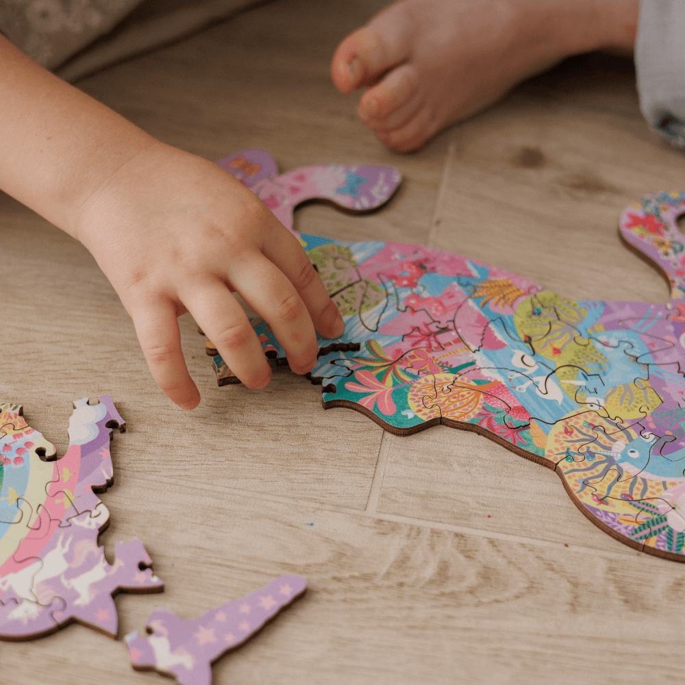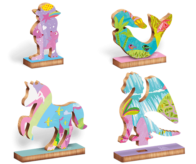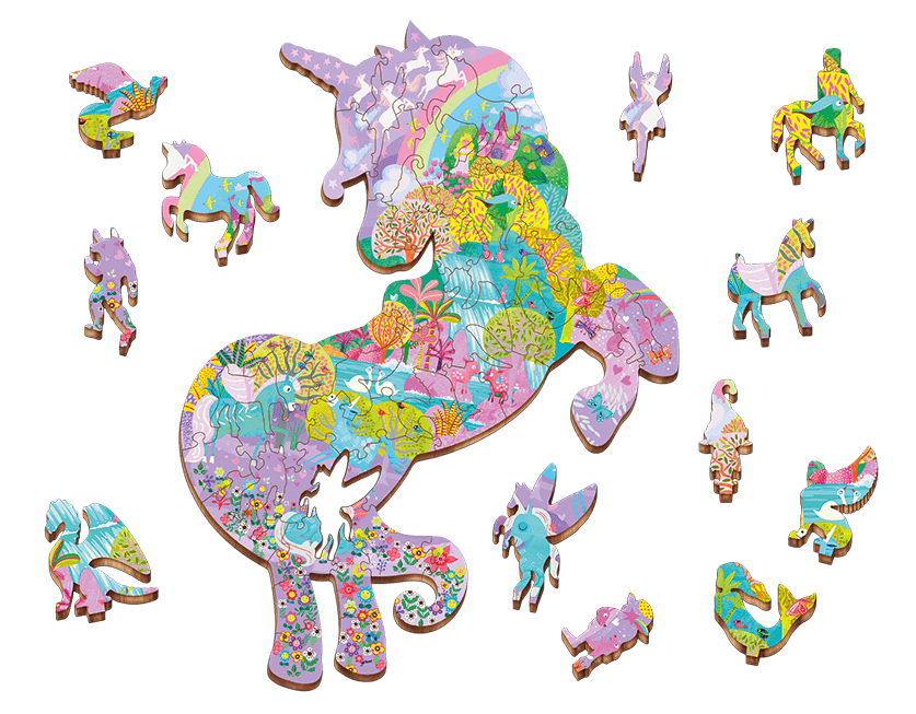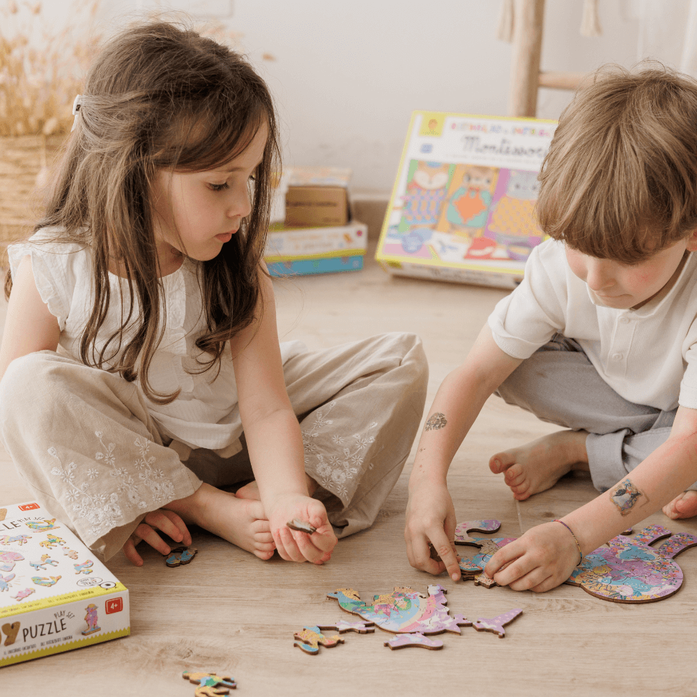 Un rompecabezas de madera de forma especial en el que está representado un colorido paisaje. Entre las piezas que componen el rompecabezas hay 12 animales perfilados que también se pueden colocar de pie sobre sus bases. El juego estimula la lógica, las habilidades visoespaciales y la motricidad fina.